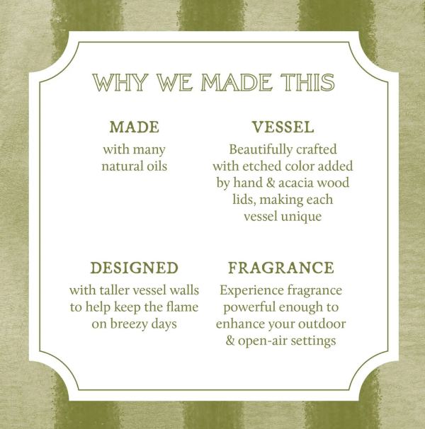 Soak in all the outdoors has to offer with the refreshing Citronella Grove Poured Candle Tin. Featuring hand drawn botanicals on the vessel, this candle was formulated to withstand the elements and fill the air with fresh and earthy notes of olive leaf, citronella, lemon grass, gardenia, sage, and cedarwood.