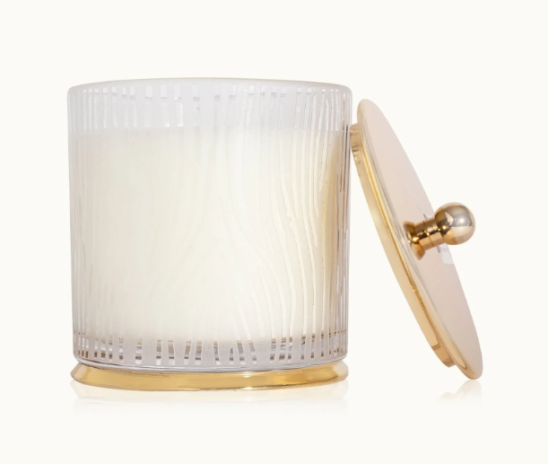 Elevate the ambiance of your living space with the elegant Frosted Wood Grain Large Poured Candle. This luxurious candle boasts a frosted wood grain design, a chic gold lid, and a gold-edged base for a touch of sophistication. Infuse your home with the inviting scent of Frasier Fir, reminiscent of a freshly cut forest. The warm glow of this candle will create a cozy atmosphere, perfect for relaxing or entertaining. Add a touch of glamour to any room with this exquisite candle.