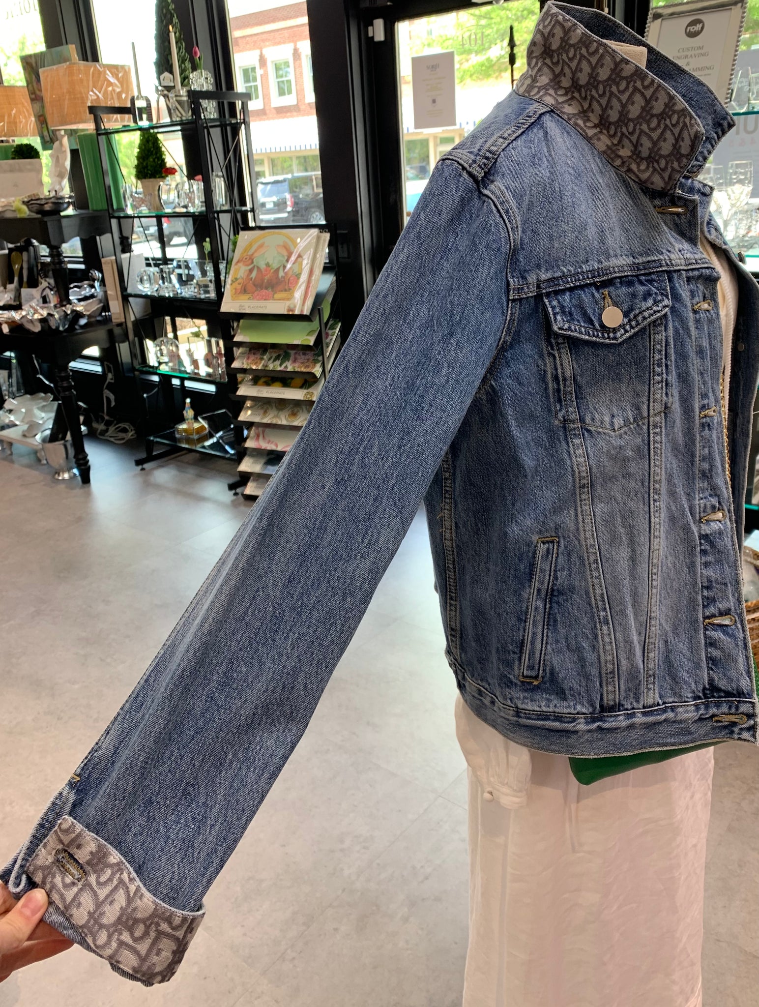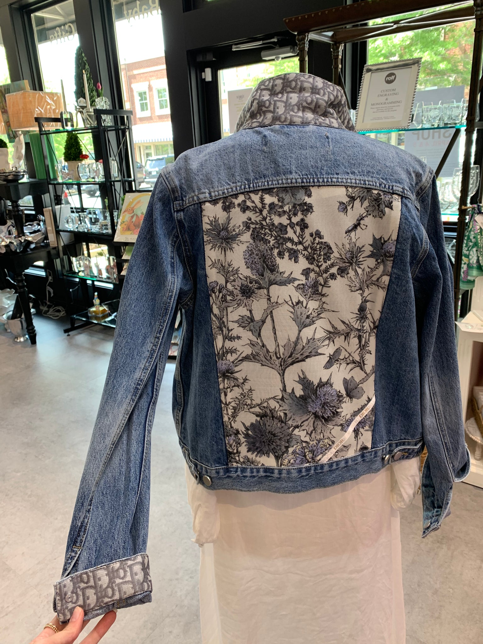 Elevate your style to a new standard with this one-of-a-kind denim jacket adorned with an authentic designer silk scarf. Each piece is crafted with unique trimmings from top designers, making it a cool and exclusive addition to your wardrobe.