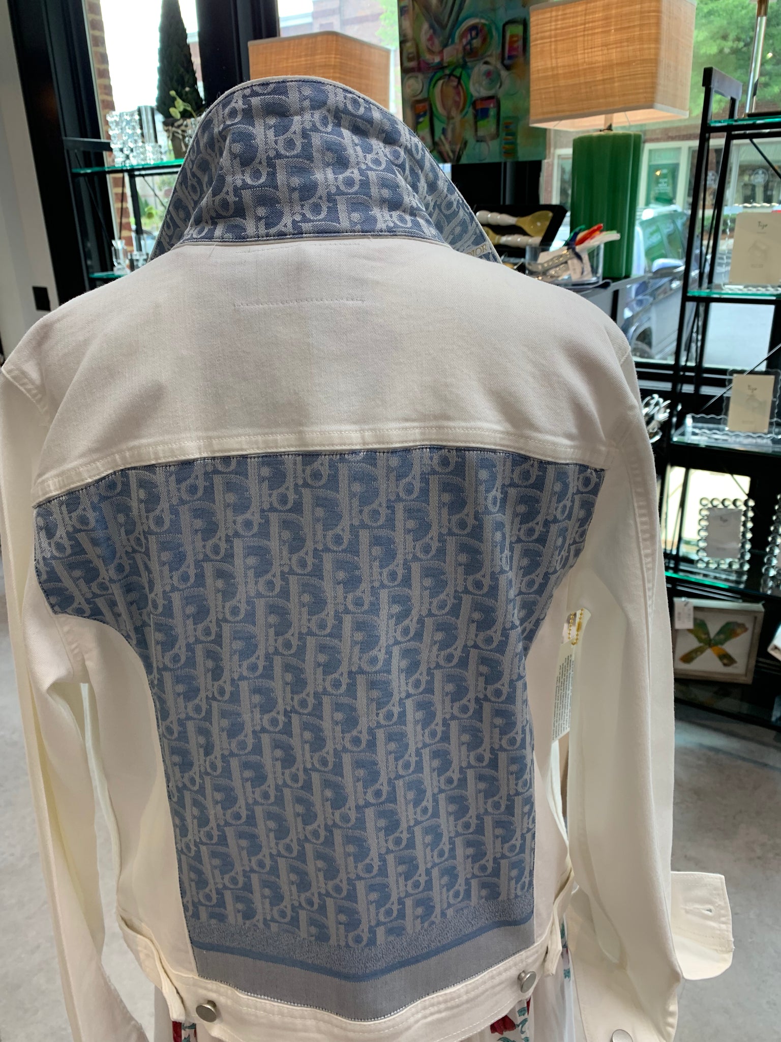 Elevate your style to a new standard with this one-of-a-kind denim jacket adorned with an authentic designer silk scarf. Each piece is crafted with unique trimmings from top designers, making it a cool and exclusive addition to your wardrobe.
