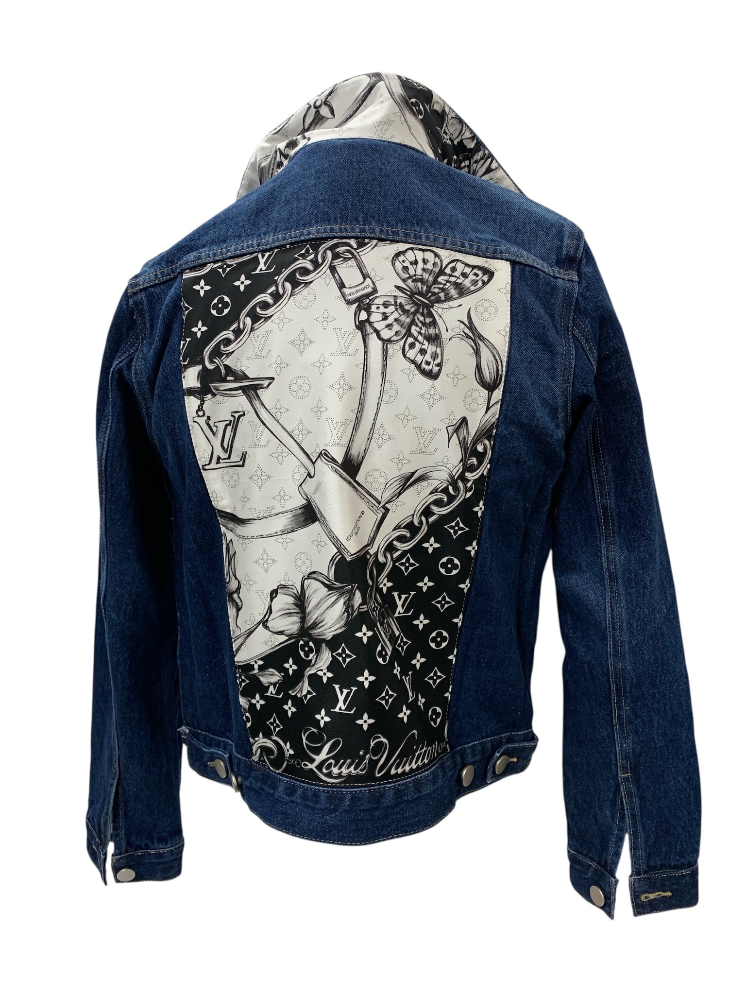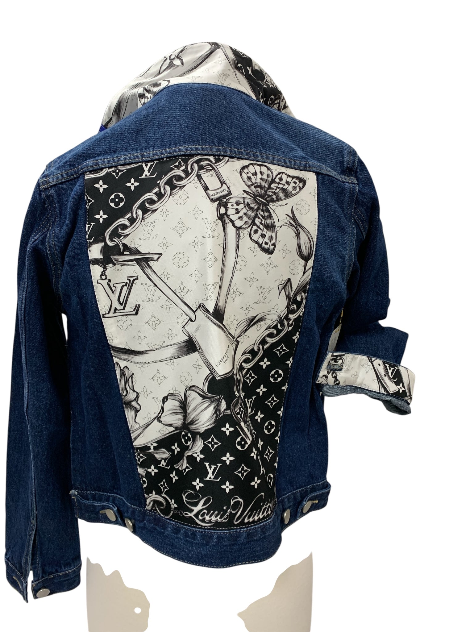 Elevate your style to a new standard with this one-of-a-kind denim jacket adorned with an authentic designer silk scarf. Each piece is crafted with unique trimmings from top designers, making it a cool and exclusive addition to your wardrobe.