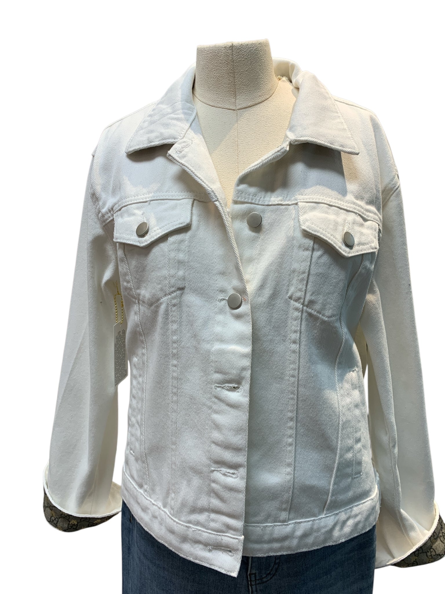 Elevate your style to a new standard with this one-of-a-kind denim jacket adorned with an authentic designer silk scarf. Each piece is crafted with unique trimmings from top designers, making it a cool and exclusive addition to your wardrobe.