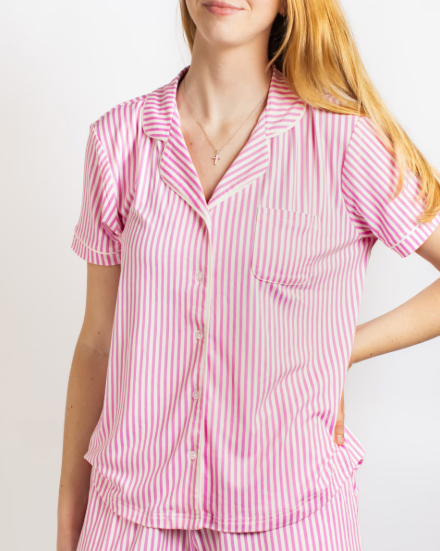 Pinstripe Short Sleeve Button Up Sleep Shirt | Pink/White