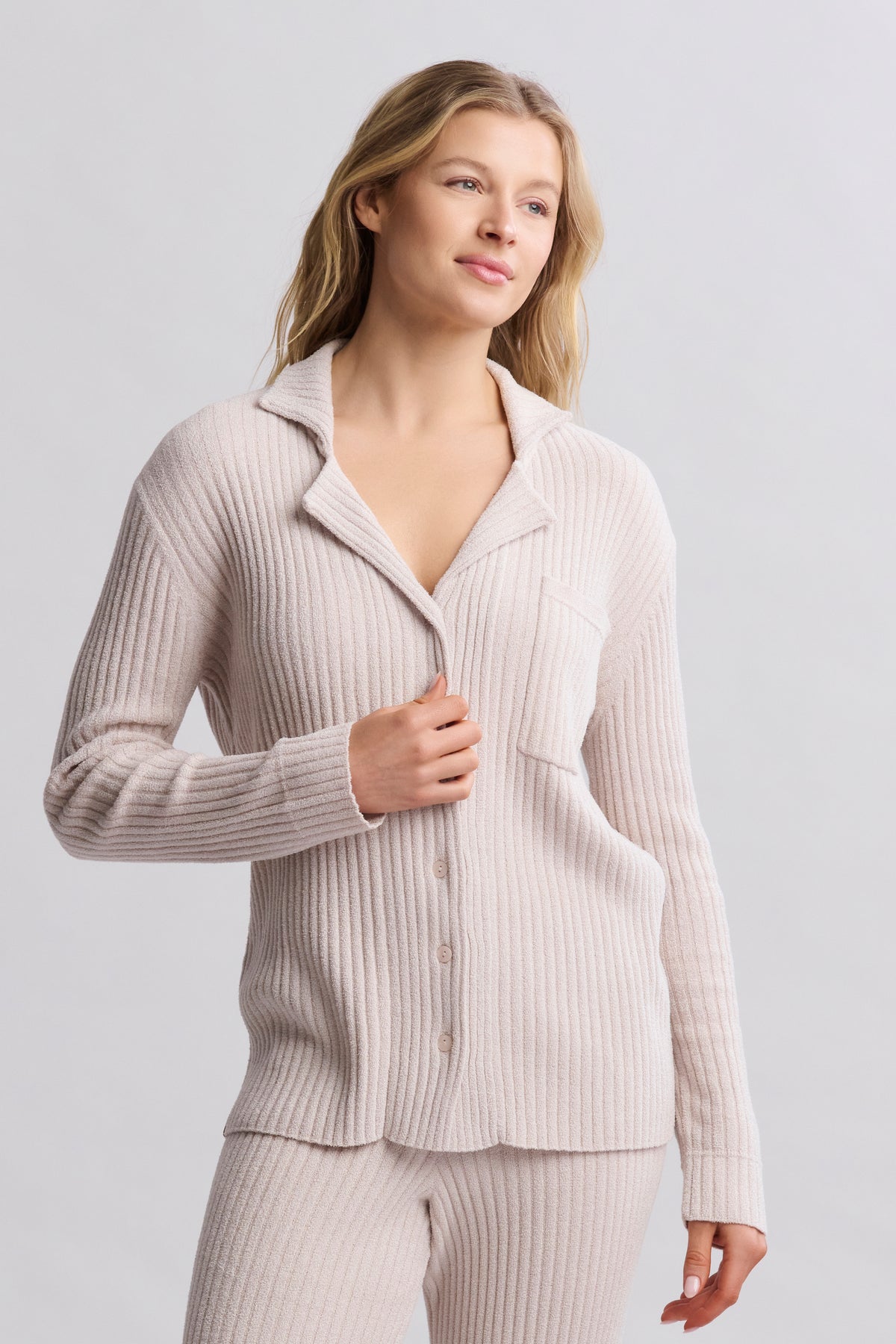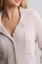 From our Day to Night Collection®, our CozyChic Ultra Lite® Lurex Rib Button Front Shirt blends effortless comfort with a subtle hint of glam and is Where shimmer meets softness. Crafted from a lightweight, all-over rib knit woven with delicate lurex threads, this relaxed-fit button-down catches the light while keeping you cozy. Designed with thoughtful details like a notch collar, a front patch pocket with rib trim, and a pinched seam at the wrist that nods to classic pajama styling, this versatile shirt transitions seamlessly from lounge to street. Finished with shell buttons and a flattering low-hip length, it's your new go-to for elevated ease. Complete the set with our CozyChic Ultra Lite® Lurex Rib Wide Leg Pant. Imported.